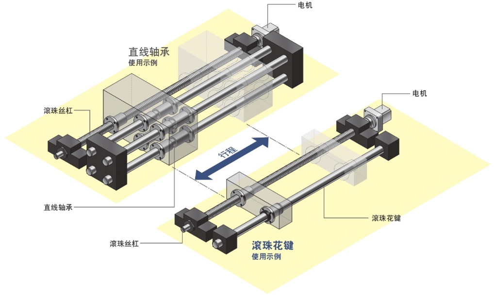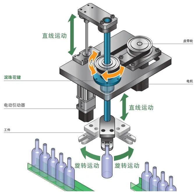 滾珠花鍵通過單軸傳遞扭矩,因此可實(shí)現(xiàn)直線及旋轉(zhuǎn)的組合運(yùn)動(dòng)。