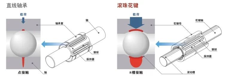 與直線軸承不同,滾珠花鍵具有滾動(dòng)槽。滾動(dòng)槽具有與鋼球類似的R形,因此可大幅度增加承載的載荷,實(shí)現(xiàn)高承載能力及長使用壽命。與直線軸承相比,其容許載荷為直線軸承的13倍,壽命約為直線軸承的2200倍。